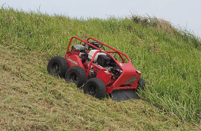 リモコン操作で、人が近づけない場所でも安全に草刈りができる機械です。この分野には早い段階から取り組んでいて、特に草刈り性能には自信のある製品です。