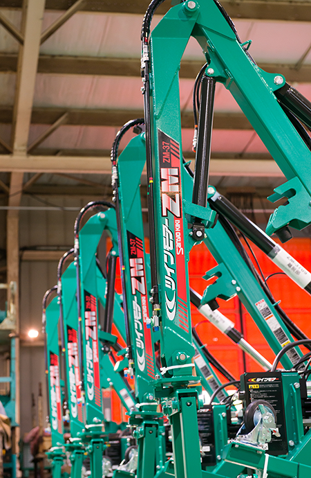 私たちの会社は、主に「トラクターにつけて使う作業機」の開発・設計と製造をおこなっています。主力製品は大きく分けて2つです。1つは、フロントローダといって、トラクターの前につけるシャベルのような機械です。土や資材をすくったり運んだり持ち上げたりするためのもので、これは弊社で昔から作り続けてきた代表的な製品です。